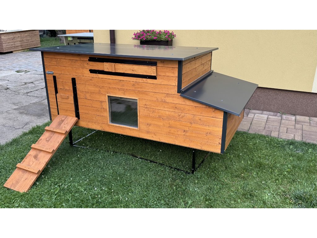 Kurník má vnější rohy a střechy oplechované barveným pozinkovaným plechem pro ještě lepší a moderní vzhled