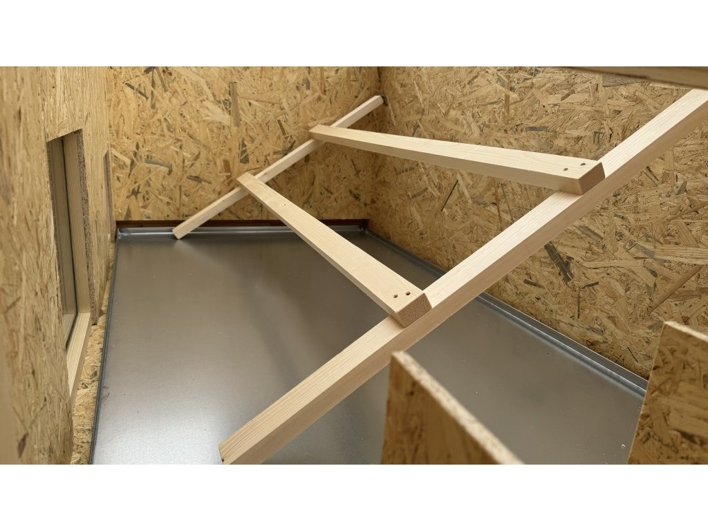 Vnější opláštění ze sušených smrkových palubek, vnitřní část tvoří broušené OSB desky odolné proti vlhkosti. Rohy jsou zpevněny šedými plechovými lištami pro maximální životnost.